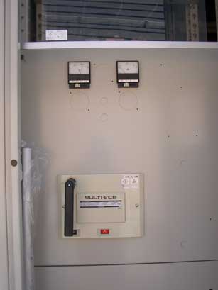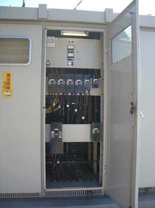 配線用遮断器(MCCB) 変圧器からの100ボルト、200ボルトの電気は、動力盤(200V)、電灯盤(100V)に接続され、回路別に区分された配線用遮断器からケーブルにてそれぞれの負荷に供給されます。それぞれの回路で過電流が流れると配線用遮断器は自動遮断されます。 |